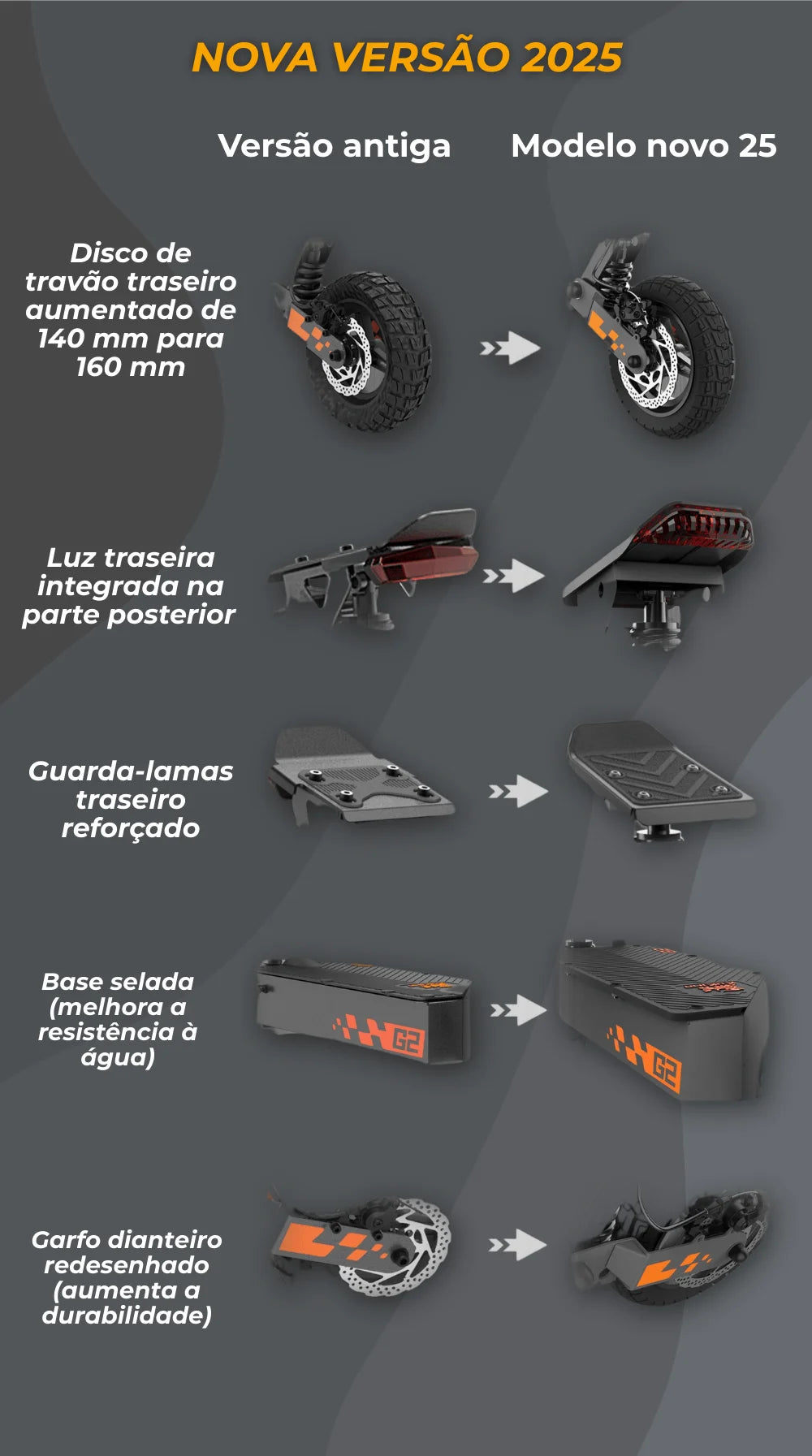 Com o compromisso de oferecer uma experiência cada vez mais segura e duradoura, a KuKirin lançou a nova versão do G2 para 2025, equipada com atualizações importantes em componentes estruturais e de segurança.